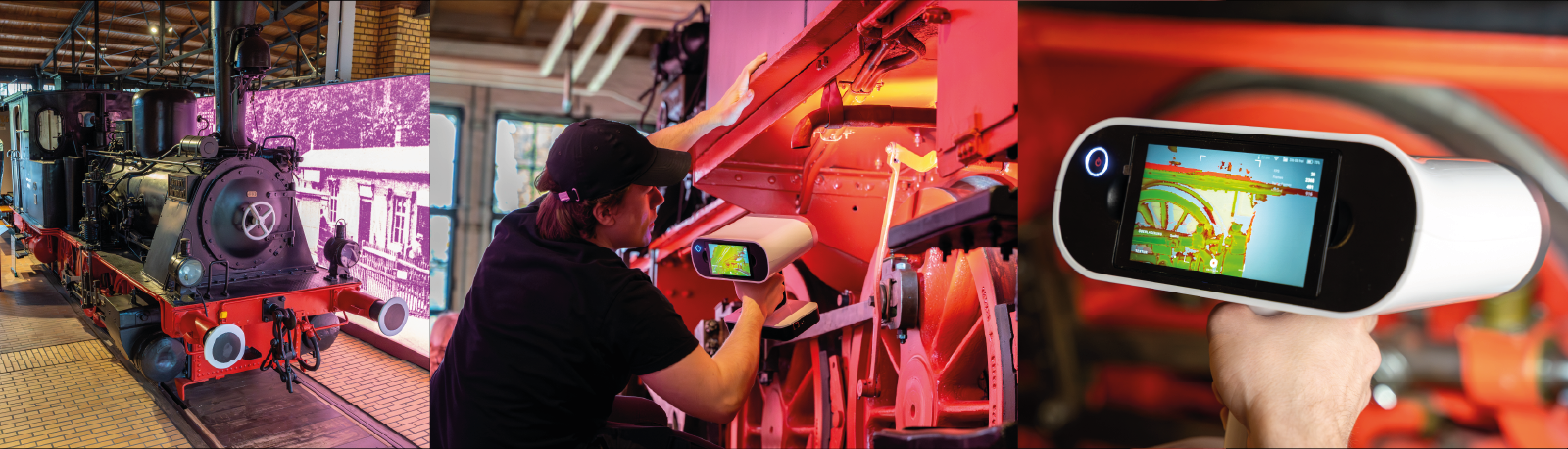 Zunächst wurde mit unserem modernsten 3D-Scanner, dem Artec Leo, die Geometrie der Lok erfasst. Während die erfassten Daten auf dem Gerät verrechnet wurden, wurden mithilfe von zwei spiegellosen Digitalsystemkameras Hunderte Bilder der Lok für die Photogrammetrie aufgenommen.